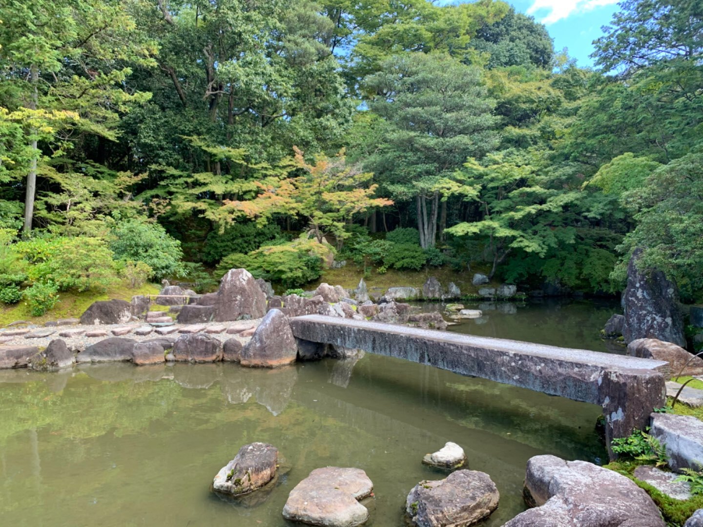 賀茂川石を並べて海岸に見立てた州浜と天橋立に見立てた中島と石橋。その奥に松琴亭。