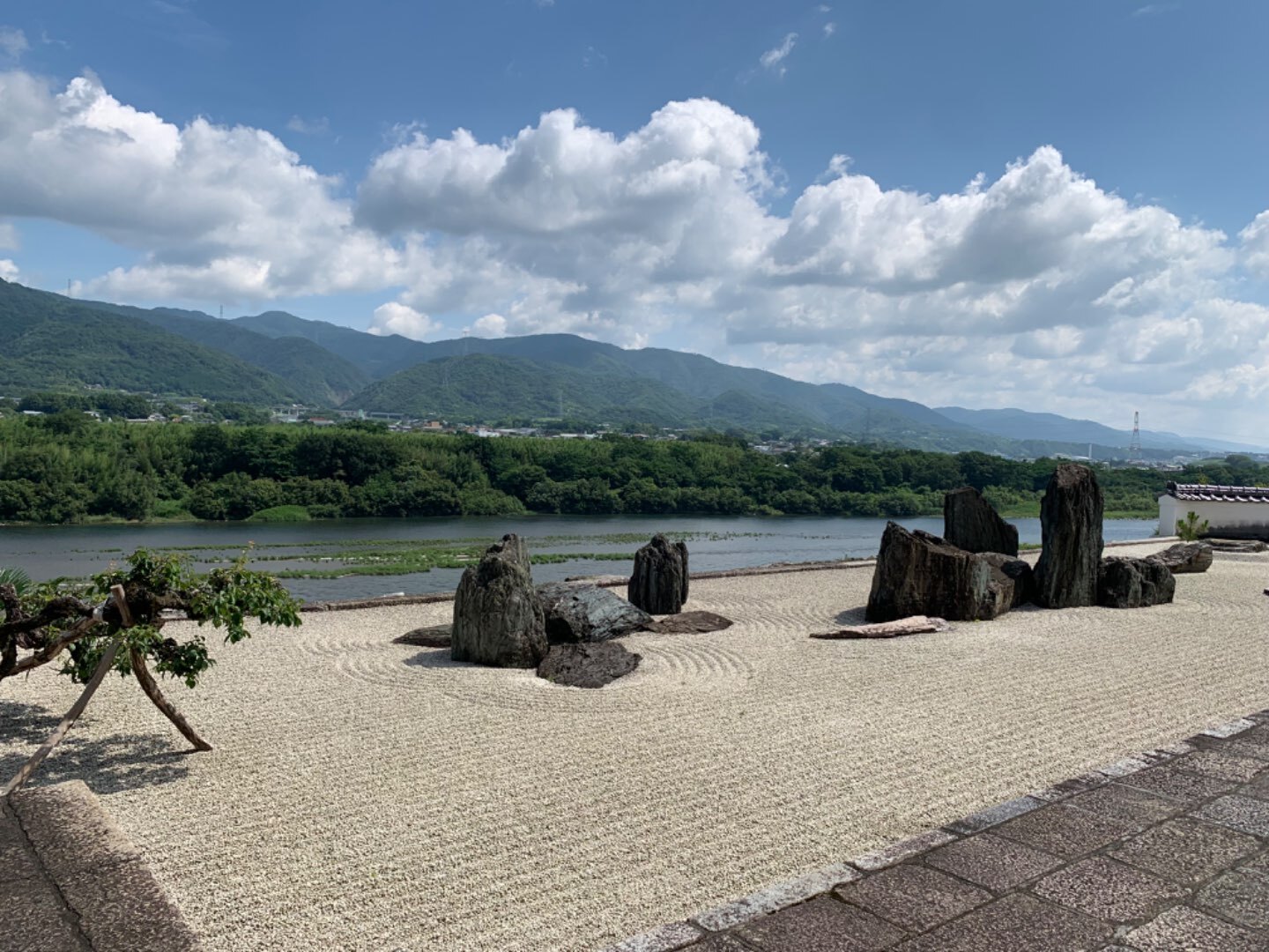 徳島県美馬市にある本楽寺には、阿讃山脈と吉野川を借景にした雄大な枯山水庭園がある。遮るものが何一つないその雄大な景色には、時間を忘れさせてくれる魅力がある。